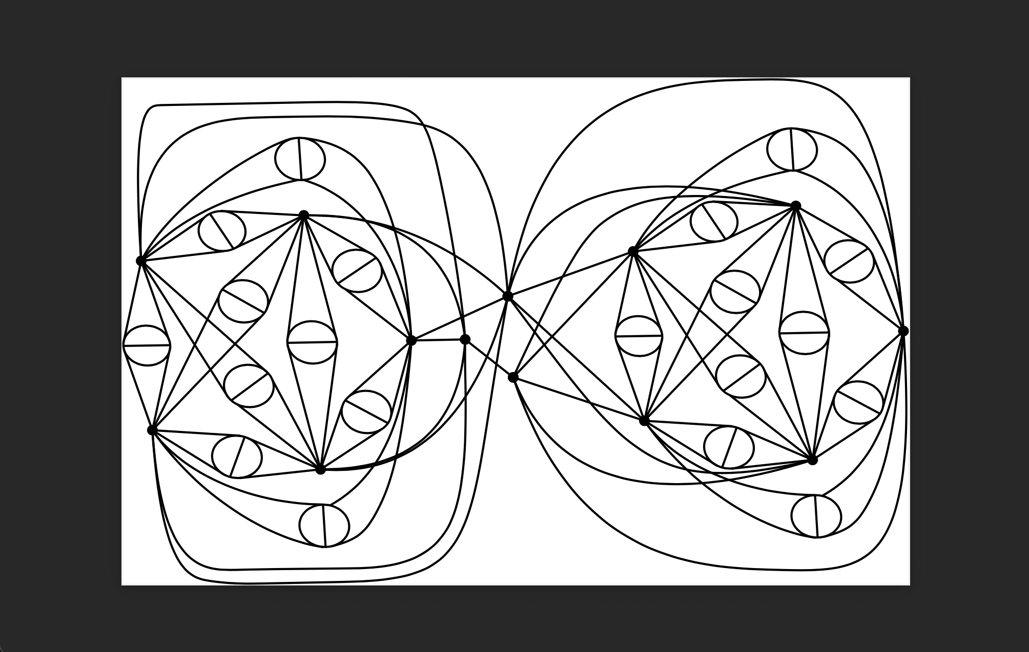 The graph on the left is a (3,9)-cage, that is, a smallest (58 vertices) cubic graph with girth 9. The graph on the right is obtained by adding an edge between all vertices of distance exactly 2 on the left.