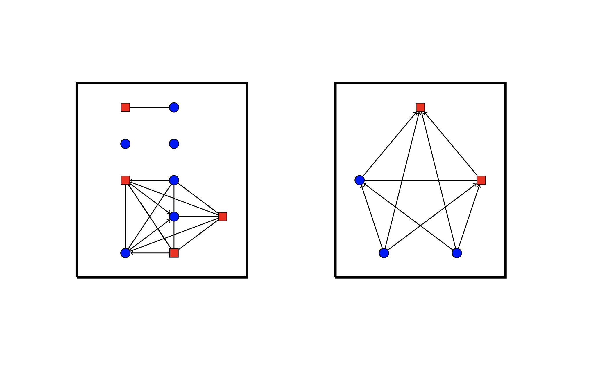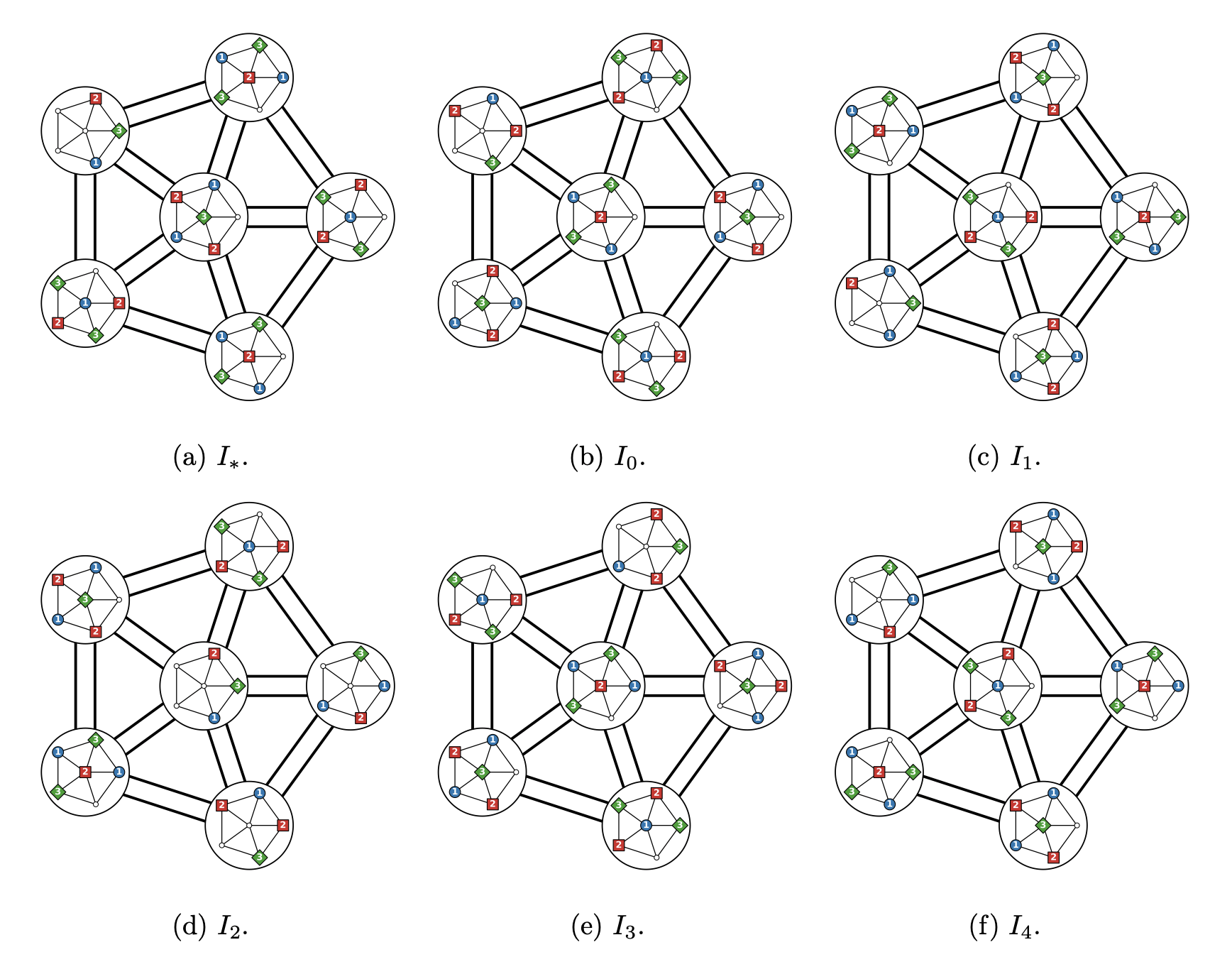 A maximum independent set (of size 170) in the third Cartesian power of W_5 Cartesian product with K_3. The independent set is displayed as a maximum 3-colouring of the third Cartesian power of W_5, and the the third Cartesian power of W_5 is displayed as 6 stylised copies of he second Cartesian power of W_5 using the obvious partition.